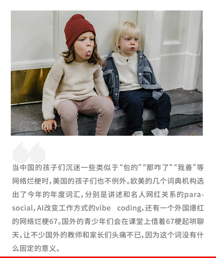 年度词汇核心观点 - 2025年三大权威机构发布的年度词汇集中反映了社交媒体和AI对个人生活、工作方式及流行文化的深刻改变,其交叉点正是AI技术 [5][9][11][44] 剑桥词典年度词汇:准社会关系 - 年度词汇为"parasocial",指用户与明星、网红、AI或虚拟角色建立的近似真实社会的单向关系 [5] - 典型案例包括泰勒·斯威夫特粉丝因偶像订婚产生共情,以及网红ishowspeed拉黑粉丝事件使该词搜索量激增 [5][7] - 粉丝为ishowspeed撰写的恋爱解读帖浏览量超过1100万次,体现准社会关系中的极端情感投入 [7] - 剑桥大学教授指出该现象重新定义了粉丝文化、明星文化及AI如何改变线上互动方式 [9] 柯林斯词典年度词汇:AI编程变革 - 选中"vibe coding",指用自然语言提示AI生成计算机代码的工作方式 [9] - 该词由AI专家安德烈·卡帕西创造,用户仅需口述需求即可通过AI完成代码编写,实现"基本不触碰键盘" [11] - DeepSeek等AI工具已融入日常生活,学生和程序员普遍使用AI辅助学习与工作 [11] - 候选词包括"科技富豪集团",指马斯克等科技亿万富翁在政治场合显眼出席的现象 [13] Dictionary.com年度符号:网络梗文化 - 破例选择数字"67"作为年度词汇,源自说唱歌手Skrilla歌曲中的重复数字 [4][18] - 该梗通过Ins和TikTok传播,配以专门手势后成为美国10后青少年口头禅,因无明确含义可应用于任何场合 [4][20][23] - 教师反映学生课堂滥用"67"导致教学中断,澳大利亚部分教师选择融入互动教学 [23][24] - 类似无意义梗如"skibidi"曾创下超50亿次YouTube观看量,卡戴珊女儿曾佩戴相关主题项链 [25][27] 社交媒体现象与商业应用 - 无意义AI生成图像(如"意大利脑腐"系列)在TikTok获百万播放量,衍生游戏《偷走脑腐》一天内吸引2400万玩家 [31][34] - 麦当劳、达美乐等品牌利用"67"梗开展促销活动,如指定时段免费赠送产品 [32] - 神经心理学家指出此类碎片化内容通过多巴胺刺激捕获儿童注意力,可能损害长期专注力与深度思考能力 [42] 世代文化差异与影响 - Alpha世代(2010年后出生)作为网络原生代,对无意义梗接受度更高,推动其成为社交媒体主流内容 [44] - 历史角度看,每代流行语(如cool、YOLO)初期均受争议,随后可能被主流文化吸纳 [46] - 教育者面临"禁止"或"接纳"网络烂梗的抉择,需平衡短期流行与长期教育目标 [46]