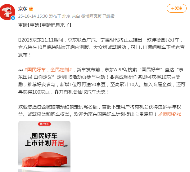 对此,京东方面向记者表示,此次联合将围绕用户真实痛点展开研发与设计,重点聚焦性能安全、外形 时尚、续航能力、价格亲民四大方面,力求实现最优平衡,推出一款大家能够买得起、能满足大家90% 以上生活通勤需求的"国民好车"。同时,三方还将通过推动汽车产品从生产到服务的全链条智能化升 级,让买车像买手机一样方便。 10月14日,京东微博账号发文称:2025京东11.11期间,京东联合广汽、宁德时代将正式推出一款神秘 国民好车,官方将在10月底将陆续开启内测版、大众版试驾活动,⏰11.11期间新车正式官宣发布! 根据规划,该车将于京东11.11期间正式发布,并在京东进行独家销售。即日起,用户可在京东App搜 索"国民好车"提前预约试驾,享受系列超值早鸟权益。 其中,京东作为零售及零售基础设施服务商,将充分发挥在用户洞察及线上线下全渠道汽车消费与服务 方面的优势。广汽集团则致力于成为移动生活价值创造者,始终坚守安全底线与功能价值,满足用户核 心需求。广汽拥有全球一流的新能源汽车灯塔工厂、中欧双五星安全标准车身设计、全球领先的纯电专 属平台等自主研发技术。此次合作将基于广汽在智能制造、全域安全技术与全球化研发体系的硬核实力 ...