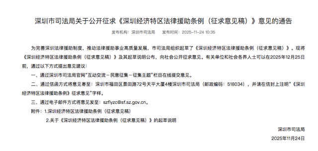 《深圳经济特区法律援助条例(征求意见稿)》公布