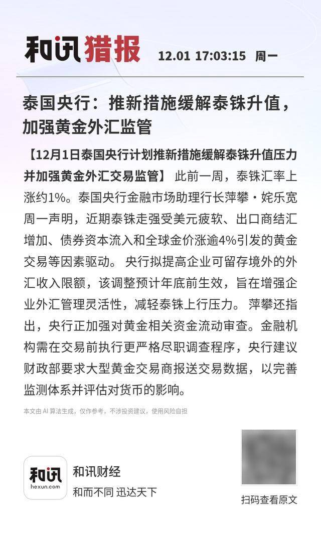 泰国央行:推新措施缓解泰铢升值,加强黄金外汇监管