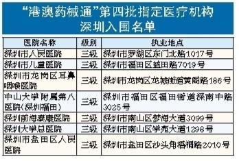 | "港澳药械通"第四批指定医疗机构 | | | | --- | --- | --- | | 深圳入围名单 | | | | 医院名称 | 80 81 | 执业地点 | | 深圳市人民医院 | 三级 | 深圳市罗湖区东门北路1017号 | | 费者用了出店发 | 三级 | 深圳市福田区益田路7019号 | | 深圳市站 家区县 咽喉医院 | 三级 | 深圳市龙岗区龙城新道黄图路186号 | | 六保属这佛长三出 | 三级 | 深圳市福因区福田街道深南中路 | | (因肥云浅)造成 | | 3025号 | | 超越黄明庭品店站 | 三级 | 深圳市南山区梦悟大道3099号 | | 深圳大学总医院 | 三级 | 深圳市南山区学苑大道1298号 | | 深圳市盐田区人民 医院 | 三级 | 深圳市盐田区沙头角梧相路2010号 | 根据"港澳药械通"政策,粤港澳大湾区内地指定医疗机构经广东省审批后,可使用临床急需、已在港澳 上市的药品,以及临床急需、港澳公立医院已采购使用、具有临床应用先进性的医疗器械。 据广东省卫生健康委员会介绍,今年8月,该委启动"港澳药械通"第四批指定医疗机构申报工作,并组 织对前三批指定医疗机构 ...