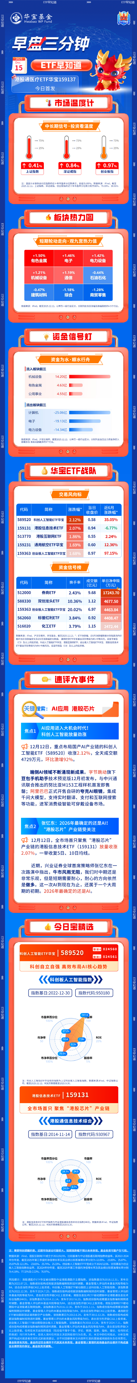 市场整体概览 - 截至2025年12月12日,主要股指的市盈率分位数显示市场估值水平不一,上证指数近十年市盈率分位数为90%,深证成指为79.09%,创业板指为39.96% [1] 行业板块表现 - 当日涨幅靠前的申万一级行业包括电子(+1.50%)、有色金属(+1.46%)、电力设备(+1.42%)、机械设备(+1.21%)和通信(+1.19%) [1][13] - 当日跌幅靠前的申万一级行业包括石油石化(-0.44%)、建筑材料(-0.47%)、综合(-1.18%)和商贸零售(-1.28%) [2][13] 主力资金流向 - 当日主力资金净流入额最多的三个行业是机械设备(14.20亿元)、有色金属(4.63亿元)和公用事业(4.55亿元) [2][13] - 当日主力资金净流出额最多的三个行业是计算机(-25.06亿元)、电子(-19.13亿元)和电力设备(-14.34亿元) [2][13] ETF产品动态与表现 - 港股通医疗ETF华宝(159137)于2025年12月12日首发 [1] - 部分ETF产品当日表现突出,科创人工智能ETF华宝(589520)收涨2.12%,港股信息技术ETF(159131)收涨2.07%,港股互联网ETF(513770)收涨1.86%,通用航空ETF华富(159231)收涨1.69%,创业板人工智能ETF华宝(159363)收涨1.68% [4][14] - 部分ETF产品近6个月涨幅显著,科创人工智能ETF华宝(589520)近6月涨35.05%,创业板人工智能ETF华宝(159363)近6月涨97.15% [2][4][14] - 部分ETF产品成交活跃,券商ETF(512000)当日成交额9.68亿元,创业板人工智能ETF华宝(159363)当日成交额6.97亿元且换手率达20.02% [4][14] AI产业焦点事件 - 2025年12月12日,科创人工智能ETF(589520)成交额达4729万元,环比激增92% [4][16] - 端侧AI领域近期涌现新成果,包括字节跳动发布豆包手机助手技术预览版并与中兴通讯联合推出努比亚M153工程样机,以及阿里巴巴开售集成千问大模型的夸克AI眼镜 [4][16] - 兴业证券全球首席策略师张忆东近期指出,AI仍处于大周期初期,并认为2026年最确定的投资方向仍是AI [6][17] - 全市场首只聚焦“港股芯片”产业链的港股信息技术ETF(159131)于2025年12月12日放量上涨2.07%,收复5日和10日均线 [6][17] 相关指数信息 - 科创人工智能ETF华宝(589520)跟踪上证科创板人工智能指数(代码950180),基日为2022年12月30日 [6][17][18] - 港股信息技术ETF(159131)跟踪中证港股通信息技术综合指数(代码930967),基日为2014年11月14日 [8][18]