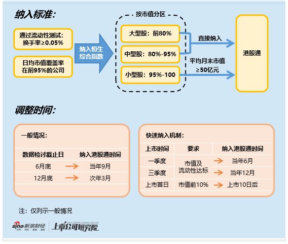 炒股就看金麒麟分析师研报,权威,专业,及时,全面,助您挖掘潜力主题机会! 出品:新浪财经上市公司研究院 作者:喜乐 2025年港股通市场迎来常态化调整,截至9月底共计纳入67只个股、剔除61只个股。其中,27只上市不满半年的新股(不含A to H公司,根据 规则A to H公司稳市期结束后自动纳入)通过规则通道实现快速入通,这类新股的考核周期充分性、后续股价波动等问题,近期持续引发市 场关注与热议。 根据港股通规则,纳入港股通的一般规则如下(不含A to H公司、同股不同权公司、第二上市公司、外国公司等特殊情况): 纳入要求: 考核期内,日均市值在香港市场中累计覆盖率为前95%,且通过流动性测试,即可纳入恒生综合市值指数。按照市值分区,将恒生综合市值 指数成分股分为大型股、中型股、小型股。其中恒生综合大型股及中型股可以直接纳入港股通,恒生综合小型股还需要额外满足平均月末市 值不低于50亿港元,才能纳入港股通。 调整时间: 一般情况:数据检讨截止日分别在每年6月底、12月底,满足条件的个股,将分别在当年9月、次年3月纳入恒生综合市值指数(分大、中、 小),并同步纳入港股通。 快速纳入机制:1)针对一、三季度上市 ...
