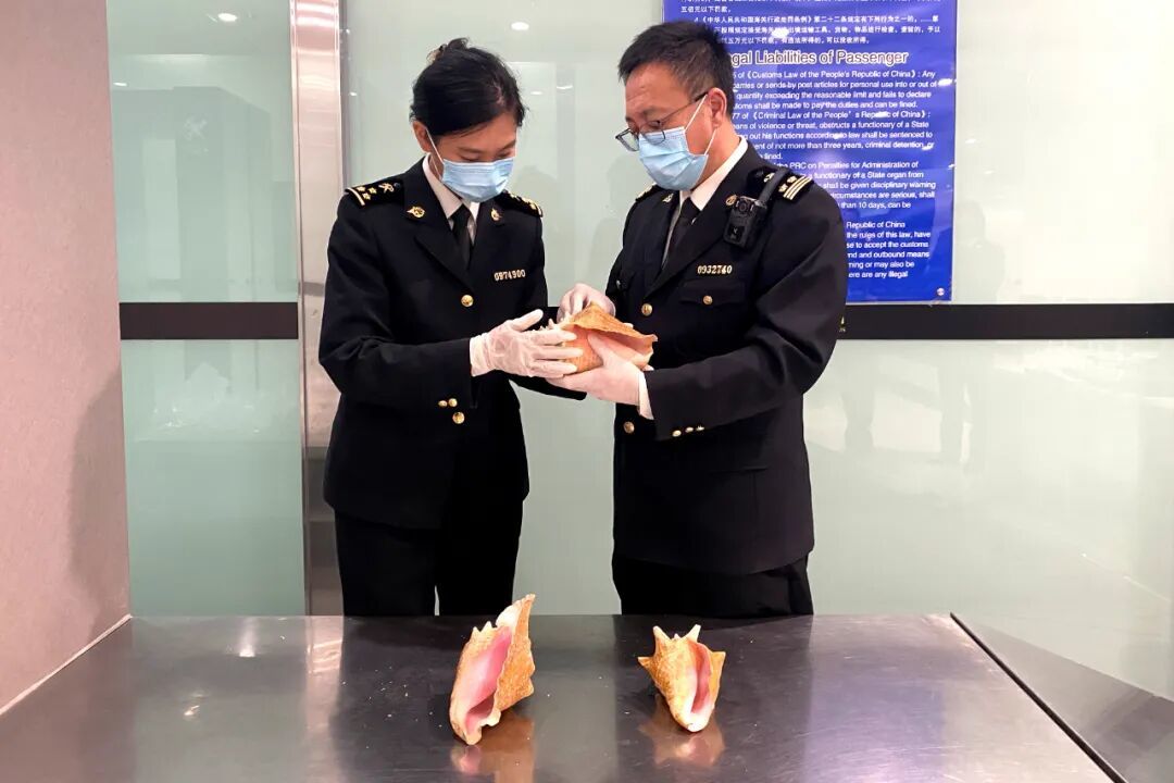 旅客违规携带女王凤凰螺螺壳3枚,被大连周水子机场海关查获