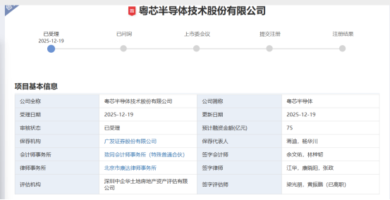 12月19日,粤芯半导体技术股份有限公司(简称"粤芯半导体")的创业板IPO申请正式获深交所受理, 本次粤芯半导体拟募集资金75亿元,保荐机构为广发证券。 | LOP . | | ■ 粤芯半导体技术股份有限公司 | | | | --- | --- | --- | --- | --- | | 已發現 | 已同响 | 上市委会议 | 提交注册 | 注册结果 | | 2025-12-19 | 0 | 0 | œ | | | 项目基本信息 | | | | | | 公司全称 | 电芯半导体技术股份有限公司 | 公司道称 | | 电芯半导体 | | 受理日期 | 2025-12-19 | 更新日期 | | 2025-12-19 | | 章被状态 | 已受理 | 预计融资金额(乙元) | | 75 | | 倡積机构 | 广发证券股份有限公司 | 假荷代表人 | | 聘曲,杨俐川 | | 会计师事务所 | 致园会计师事务所(特殊善通合伙) | 签字会计师 | | 余文佑,林梓树 | | 律师事务所 | 北京市康达律师事务所 | 签字律师 | | 江华,康晓阳,张政 | | 评估机构 | 深圳中企华土地房地产资产评估有限 公司 ...