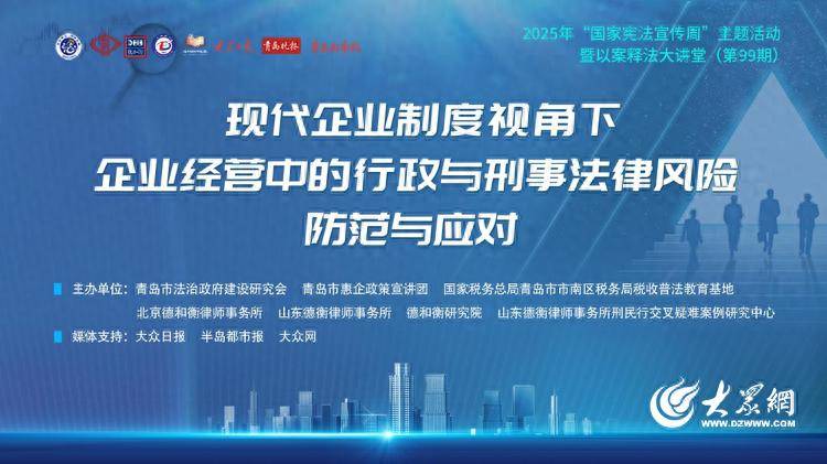 大众网记者 唐嘉宝 通讯员 殷程程 青岛报道 为帮助企业筑牢合规防线,提升风险应对能力,在"国家宪法宣传周"到来之际,由青岛市法治政府建设研 究会、青岛市惠企政策宣讲团、国家税务总局青岛市市南区税务局税收普法教育基地、北京德和衡律师事 务所、山东德衡律师事务所、德和衡研究院、山东德衡律师事务所刑民行交叉疑难案例研究中心共同主办 的"现代企业制度视角下企业经营中的行政与刑事法律风险防范与应对"为主题的第99期"以案释法大讲 堂"成功举办,40余名企业家菁英代表和法律从业者现场参与。 本期大讲堂由山东德衡律师事务所高级权益合伙人、党委副书记,青岛市法治政府建设研究会副会长姜保 良主持。 山东德衡律师事务所高级权益合伙人、执行总裁,青岛市民营企业协会副会长杨培银作开幕致辞。杨培银 代表主办方对参加本次活动的各位嘉宾朋友表示热烈欢迎与感谢后指出,在当今复杂多变的国际国内市场 环境下,构建现代企业制度既是党和国家重大战略部署,是推动国家经济社会高质量发展的重要抓手,也 是企业自身稳健发展、基业长青的重要基石。本期讲座结合中央"防止和纠正利用行政、刑事手段干预经 济纠纷"的部署要求,就企业在经营过程中如何有效防范和应对行 ...