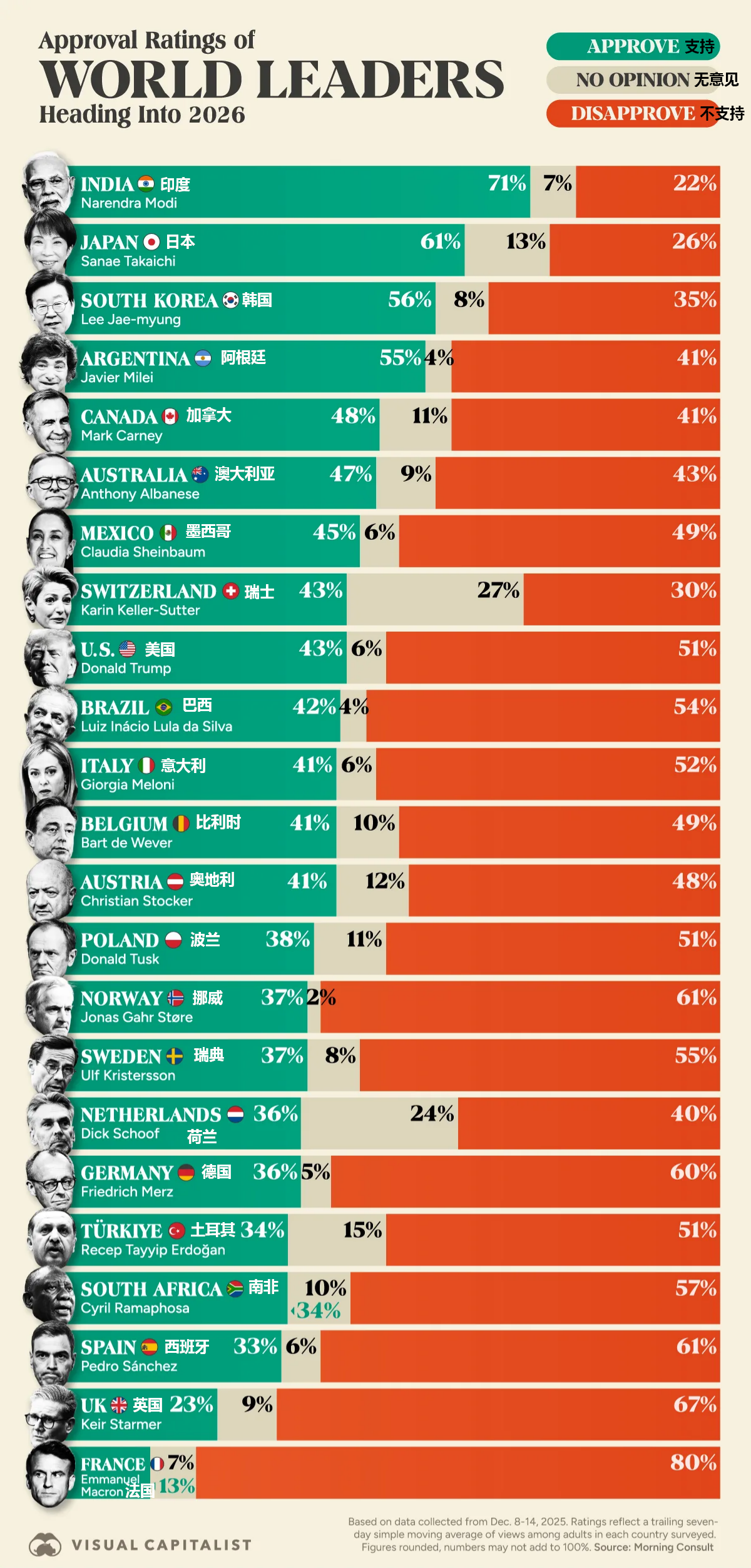 根据Morning Consult于2025年12月8日至14日进行的调查,下图按支持率对全球多位主要领导人进行了排名。 印度总理莫迪以71%的支持率位居榜首,但较2025年1月的75%略有下降。其他国家也出现了类似的趋势:即使是排名靠前的领导人,其支持率也在这一年 中有所下降,反映出持续的通胀、生活成本压力以及选民的政治疲劳。 日本、韩国、加拿大、奥地利和比利时的领导人在2025年底的支持率均有所上升,主要源于领导人的更迭。 | INDIA @ 印度 | | | | 71% | | 7% | 2 | | --- | --- | --- | --- | --- | --- | --- | --- | | Narendra Modi | | | | | | | | | JAPAN O 日本 | | | 61% | | 13% | | 2 | | Sanae Takaichi | | | | | | | | | SOUTH KOREA ◎ 韩国 | | | 56% | 8% | | | | | Lee Jae-myung | | | | | | | | | ARGENTINA ● 阿根廷 | | | 55% 4% ...
