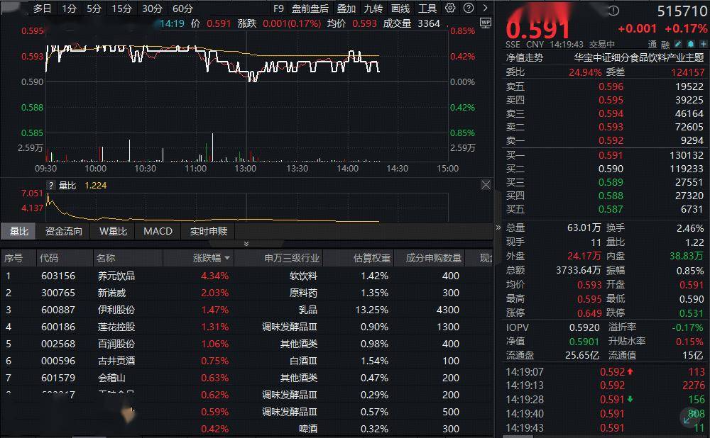 吃喝板块午后有所回落,截至发稿,反映吃喝板块整体走势的食品饮料ETF华宝(515710)场内价格涨 0.17%。 成份股方面,大众品涨幅居前,部分白酒龙头亦表现亮眼。截至发稿,养元饮品大涨超4%,伊利股 份、莲花控股等涨超1%,贵州茅台、五粮液、洋河股份等白酒龙头亦小幅飘红。 | | | 分时 多日 1分 5分 15分 30分 60分 · | | | | | F9 盘前盘后 婴加 九转 图表 工具 份 2 | | > | | 食品饮料ETF华宝 ① | | 515710 | | --- | --- | --- | --- | --- | --- | --- | --- | --- | --- | --- | --- | --- | --- | | 0.59 | | | | 515710[食品饮料ETF华富] 14:19 价 0.591 器颜 0.001(0.17%) 均价 0.593 成交量 3364 | | | | | 0.859 | 0-599 | | +0.001 +0.17% | | | 0.593 | | MASTARATA | | | | | | | 0.42% | 净值击势 | SSE CNY ...