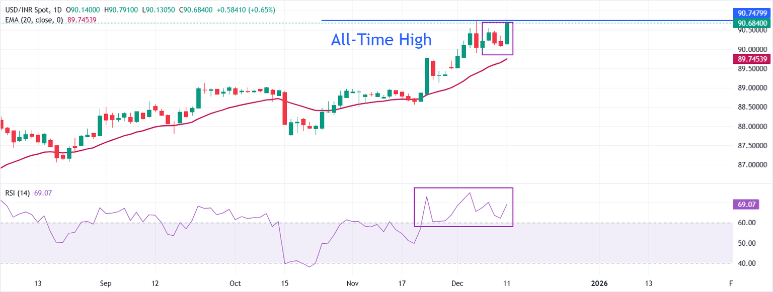 美元兑印度卢比汇率走势 - 印度卢比兑美元汇率大幅下挫,美元兑卢比汇率升至90.80附近,创历史新高 [1][2] - 周四美元兑卢比汇率上涨0.65%至90.80附近 [9] - 技术分析显示,美元兑卢比维持在89.74的20日指数移动平均线上方,短期趋势上行,14日相对强弱指数报69.09,确认看涨动能 [9][10] 美印贸易谈判进展 - 美印贸易协议的不确定性持续拖累印度卢比汇率 [1] - 美国副贸易代表抵达启动为期两天的会谈,但投资者对能否达成共识持谨慎态度 [3] - 美国贸易代表称印度是“难啃的硬骨头”,但表示新德里的最新方案是美方迄今见过的“最佳方案” [3] - 研究机构GTRI建议印度在谈判中坚持平衡,警惕在农产品或转基因产品领域让步,并指出若美方真心寻求协议,应将印度出口商品关税从50%降至25% [3] 美联储货币政策影响 - 美联储周三降息25个基点,将联邦基金利率目标区间下调至3.50%-3.75% [2][6] - 美联储点阵图显示决策者预计2026年仅会降息一次,主席鲍威尔表示“进一步宽松政策的门槛极高” [2][7] - 鲍威尔指出服务类通胀回落证据增多,商品通胀完全源于关税,若无新增关税措施,商品通胀应在第一季度见顶 [7] - 尽管美元指数表现疲软,但印度卢比仍大幅下挫,部分源于美联储的货币政策声明 [6] 市场资金流动与干预 - 美印贸易摩擦削弱海外投资者对印度股市兴趣,12月所有交易日中,外国机构投资者持续净抛售,累计减持价值1647.035亿卢比的持股 [4] - 有报道显示,印度储备银行可能抛售美元以阻止印度卢比大幅贬值 [3] 国内经济数据关注 - 国内投资者正等待将于周五公布的11月零售消费者价格指数数据 [5]