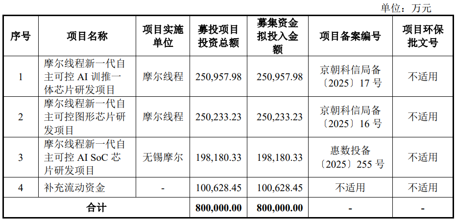 上市概况与市场表现 - 摩尔线程于2025年12月5日在上海证券交易所科创板上市,股票代码688795.SH [1] - 上市首日开盘价650.00元,收盘价600.50元,较发行价114.28元上涨425.46% [1] - 首日成交额153.07亿元,振幅115.51%,换手率85.49%,收盘总市值达2822.52亿元 [1] 公司业务与发行信息 - 公司成立于2020年,主营业务为GPU及相关产品的研发、设计和销售,以自主研发的全功能GPU为核心,为AI、数字孪生、科学计算等领域提供计算加速平台 [1] - 本次公开发行股票总数为7000万股,占发行后总股本的14.89%,发行价格为114.28元/股 [4] - 本次发行募集资金总额为799,960.00万元,扣除发行费用后的募集资金净额为757,605.23万元,较原计划的800,000.00万元募集目标少42,394.77万元 [4] - 发行保荐机构(主承销商)为中信证券股份有限公司,副主承销商包括招商证券、中银国际证券、广发证券 [4] - 保荐机构子公司中信证券投资有限公司获配140万股,占本次发行数量的2%,获配金额15,999.20万元 [6] 股权结构与实际控制人 - 公司无单一持股30%以上的股东,不存在控股股东 [2] - 实际控制人为张建中,发行前直接持股11.06%,并通过与南京神傲、杭州华傲签署一致行动人协议及担任三家员工持股平台执行事务合伙人,合计控制公司36.36%的股份 [2] - 发行后,张建中直接持有4424.2122万股,占总股本的9.41%,通过一致行动人及员工持股平台合计控制公司30.94%的股份,仍为实际控制人 [2] 募集资金用途 - 募集资金计划用于四个项目:新一代自主可控AI训推一体芯片研发项目(拟投入250,957.98万元)、新一代自主可控图形芯片研发项目(拟投入250,233.23万元)、新一代自主可控AI SoC芯片研发项目(拟投入198,180.33万元)以及补充流动资金(拟投入100,628.45万元),总投资额800,000.00万元 [4][5] - 本次发行费用合计42,354.77万元,其中保荐承销费为39,198.00万元 [5] 财务业绩表现 - 营业收入持续快速增长:2022年至2024年分别为4,608.83万元、12,398.19万元、43,845.95万元 [6] - 2025年上半年营业收入为70,176.19万元,2025年1-9月营业收入为78,459.92万元,同比增长181.99% [8][10] - 公司持续亏损但亏损额呈现收窄趋势:2022年至2024年净利润分别为-189,415.47万元、-170,290.58万元、-161,828.83万元 [6] - 2025年上半年净利润为-27,094.23万元,2025年1-9月净利润为-72,352.86万元,同比减亏18.71% [8][10] - 2022年至2025年前三季度,公司累计亏损59.39亿元 [9] - 经营活动现金流持续为负:2022年至2024年经营活动使用的现金流量净额分别为-148,951.43万元、-115,813.35万元、-195,450.88万元,2025年1-9月为-149,953.99万元 [6][8] 近期业绩与未来展望 - 2025年第三季度(7-9月)营业收入为8,283.73万元,同比增长16.60% [10] - 公司预计2025年全年营业收入为121,800.00万元至149,800.00万元,同比增长177.79%至241.65% [12][14] - 公司预计2025年全年归属于母公司股东的净利润为-116,800.00万元至-73,000.00万元,预计扣非后净利润为-123,800.00万元至-87,800.00万元,亏损同比预计收窄24.20%至54.89% [12][14] 上市审核关注要点 - 上市委审议会议问询主要问题包括:要求公司结合GPU市场主要厂商的技术路线差异、竞争格局和贸易环境影响,说明自身竞争优劣势及未来经营潜在风险的应对措施;以及结合客户情况、收入确认等说明相关产品收入确认的准确性和合规性 [3]