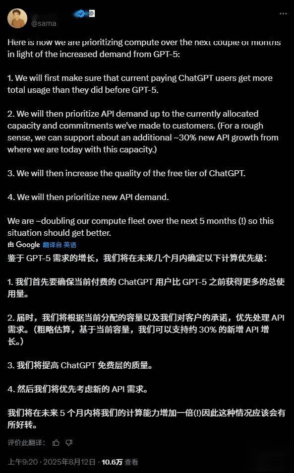 应对 GPT-5 需求增长,OpenAI CEO奥尔特曼公布算力分配计划