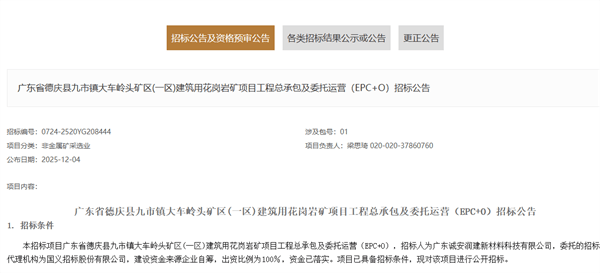 项目招标详情 - 广东省德庆县九市镇大车岭头矿区(一区)建筑用花岗岩矿项目进行工程总承包及委托运营(EPC+O)招标,合作期限23.5年,其中勘察设计工期360天、施工工期720天、运营期20.5年 [1] - 项目骨料加工系统设计年处理能力2120万吨,并配套一条年产能120万吨的风化土洗砂生产线 [1] - 项目招标控制价包括:工程勘察费1530.16万元、工程设计费2185.925万元、工程建安费及设备采购费14.57亿元、运营综合单价28.5元/吨、智慧/绿色矿山招标46718.52万元 [1] - 招标范围涵盖勘察设计、施工及运营,具体包括矿山开采、骨料加工、长胶输送廊道、陆域堆场、辅助设施以及智慧/绿色矿山建设(如光伏、储能、智能监测、无人驾驶系统等) [2] - 运营工作包括境界内剥离开采、骨料生产线运营维护、成品料装车计量、矿区地质环境恢复治理与土地复垦、以及环境保护 [3] 矿权竞得与资源储量 - 广东诚安润建新材料科技有限公司以16.13亿元竞得该矿权,该公司为国有企业,由多家国企共同投资成立 [7] - 该矿区建筑用花岗岩开采储量约1.658亿立方米,砂质高岭土储量254.81万立方米,年生产规模800万立方米 [6] - 矿区剥离总量4976.56万立方米,其中779.59万立方米残坡积土用于复垦,2013.47万立方米全风化花岗岩可水洗加工成建筑用砂,2183.50万立方米半风化岩作砌筑块石料综合利用 [6] 近期广东砂石矿权出让动态 - 在10天内,广东省云浮、肇庆、佛山等地接连成功出让4宗年产千万吨级砂石大矿 [7] - 12月初,佛山市建生矿业发展有限公司(民企)以约2.76亿元底价竞得高明区洞心矿区建筑用花岗岩矿,资源储量1.57亿吨,年生产规模810万吨 [7] - 12月2日,广东安兴绿色矿业有限公司(国企)以15亿元底价竞得云浮市云安区都杨镇佛仔顶矿区建筑用花岗岩矿、砂质高岭土矿,资源储量约7.5亿吨,年生产规模2600万吨 [8] - 12月5日,华润水泥(封开)有限公司以超2.56亿元竞得封开县河儿口镇大旺塘矿区水泥用石灰岩矿采矿权,资源储量8821.6万吨,年生产规模988万吨 [8]