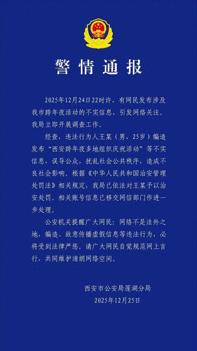 央视网消息:据"西安莲湖公安"微信公众号消息,12月24日22时许,有网民发布涉及西安市跨年夜活动的不实信息,引发网络关注。西安市公安局莲湖分局 立即开展调查工作。经查,违法行为人王某(男,25岁)编造发布"西安跨年夜多地组织庆祝活动"等不实信息,误导公众,扰乱社会公共秩序,造成不良社 会影响。根据《中华人民共和国治安管理处罚法》相关规定,西安市公安局莲湖分局已依法对王某予以治安处罚。相关账号信息已移交网信部门作进一步处 理。 地,编造、故意传播虚假信息等违法行为,必 将受到法律严惩。请广大网民自觉规范网上言 行,共同维护清朗网络空间。 西安市公安局莲湖分局 2025年12月25日 ...
