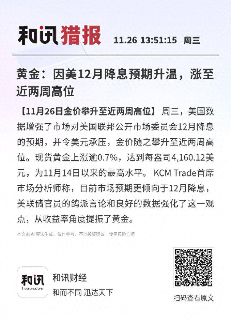 【11月26日金价攀升至近两周高位】周三,美国数据增强了市场对美国联邦公开市场委员会12月降息的预 期,并令美元承压,金价随之攀升至近两周高位。现货黄金上涨逾0.7%,达到每盎司4,160.12美元,为11 月14日以来的最高水平。KCM Trade首席市场分析师称,目前市场预期更倾向于12月降息,美联储官员的 鸽派言论和良好的数据强化了这一观点,从收益率角度提振了黄金。 本文由 AI 算法生成,仅作参考,不涉投资建议,使用风险自担 本文由 Al 算法生成,仅作参考,不涉投资建议,使用风险自担 和讯财经 和而不同 迅达天下 扫码查看原文 和训猎报 11.26 13:51:15 周三 黄金:因美12月降息预期升温,涨至 近两周高位 【11月26日金价攀升至近两周高位】周三,美国数 据增强了市场对美国联邦公开市场委员会12月降息 的预期,并令美元承压,金价随之攀升至近两周高 位。现货黄金上涨逾0.7%,达到每盎司4,160.12美 元,为11月14日以来的最高水平。 KCM Trade首席 市场分析师称,目前市场预期更倾向于12月降息, 美联储官员的鸽派言论和良好的数据强化了这一观 点,从收益率角度提振了黄金。 ...