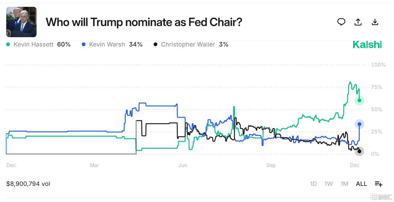 市场对美联储主席人选的预期发生重大转变 - 在预测市场上,前美联储理事凯文·沃什被提名为下一届美联储主席的概率大幅飙升,在Kalshi和Polymarket两个市场上的概率分别跃升了17和24个百分点 [1] - 在Kalshi预测市场,沃什的获胜概率正在直线飙升,几乎快追平另一位热门人选凯文·哈塞特,而哈塞特的获胜概率正在直线下降,但其50%的获胜概率目前仍领先全场 [1] 预期转变的主要催化剂 - 美国总统特朗普公开表示,已将寻找美联储主席继任者的范围缩小至“两个凯文”,即凯文·沃什与白宫国家经济委员会主任凯文·哈塞特 [4][5] - 摩根大通首席执行官杰米·戴蒙在一场非公开会议上明确表态支持沃什执掌美联储,为其增添了重要砝码 [4][6] 特朗普的候选人标准与政策倾向 - 特朗普选择候选人的标准明确,即候选人认为必须降低利率,他批评当前美联储降息幅度不够,认为至少应该是最近一次降息25个基点的两倍 [5] - 特朗普认为下一任美联储主席应就利率政策与他进行磋商,并指出他认为利率在一年内应该降至“1%,甚至可能更低” [5] 主要候选人的背景与政策前景差异 - 凯文·哈塞特作为前白宫内部人士,被视为更符合特朗普期望的人选,曾公开支持激进降息,在华尔街部分人士眼中其“执行者”标签较为浓厚 [9] - 凯文·沃什作为前美联储理事,获得了戴蒙等华尔街领袖的认可,但他在离任后对美联储的频繁批评使其在央行内部并不受欢迎,部分观点认为他在2008年金融危机前的立场“过度鹰派” [9] - 一些债券投资者担忧,由哈塞特领导的美联储可能会在追求更激进的降息时将经济增长置于价格稳定之上,这可能对国债市场造成干扰 [7] 遴选进程与市场影响 - 美国财政部长贝森特主导的遴选工作仍在进行中,预计特朗普将在下周面试更多候选人,最终人选将在未来几周内揭晓 [10] - 随着最终人选的临近,市场对候选人过往言论和政策立场的审视将愈发严格,任何风吹草动都可能引发资产价格的波动 [7] - 下一任美联储主席的角逐正日益激烈,特朗普持续公开施压要求美联储采取更激进的降息政策 [8]