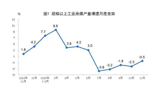 11月份,规模以上工业(以下简称规上工业)原煤生产保持稳定,原油生产增速加快,天然气生产平稳增长,电力生产保持增长。 一、原煤、原油和天然气生产及相关情况 原煤生产保持稳定。11月份,规上工业原煤产量4.3亿吨,同比下降0.5%;日均产量1423万吨。 1—11月份,规上工业原煤产量44.0亿吨,同比增长1.4%。 原油生产增速加快。11月份,规上工业原油产量1763万吨,同比增长2.2%,增速比10月份加快0.9个百分点;日均产量58.8万吨。 1—11月份,规上工业原油产量19825万吨,同比增长1.7%。 原油加工平稳增长。11月份,规上工业原油加工量6083万吨,同比增长3.9%;日均加工量202.8万吨。 1—11月份,规上工业原油加工量67507万吨,同比增长4.0%。 天然气生产稳定增长。11月份,规上工业天然气产量219亿立方米,同比增长5.7%;日均产量7.3亿立方米。 1—11月份,规上工业天然气产量2389亿立方米,同比增长6.3%。 二、电力生产情况 规上工业电力生产保持增长。11月份,规上工业发电量7792亿千瓦时,同比增长2.7%;日均发电量259.7亿千瓦时。1—11月份,规上工 ...