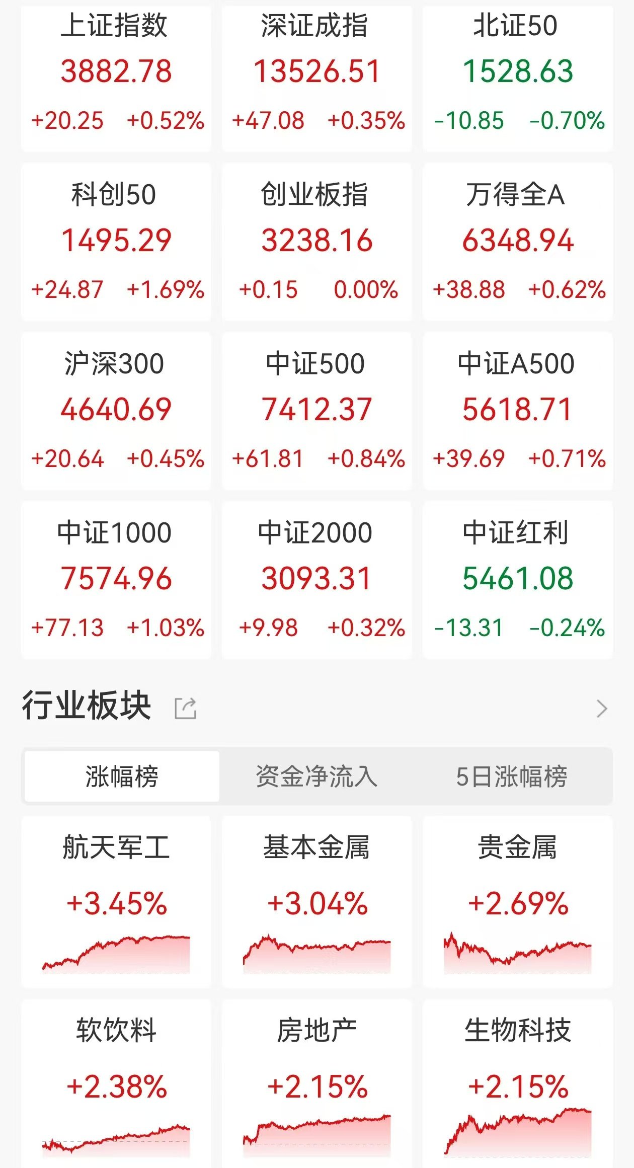 | 涨幅榜 | 资金净流入 | 5日涨幅を | | --- | --- | --- | | 航天军工 | 基本金属 | 贵金属 | | +3.45% | +3.04% | +2.699 | | 软饮料 | 房地产 | 生物科 | | +2.38% | +2.15% | +2.15° | A股主要指数今日多数录得上涨,截至收盘,沪指涨0.52%报3882点,深证成指涨0.35%,创业板指平收。全市场成交额2.2万亿元,较前一交易日增量191亿 元,超2600股上涨,超2500股下跌。 盘面上,近期不少存储芯片巨头涨价,存储芯片板块走强,江波龙、德明利等多股涨停;锂矿概念走高,德方纳米涨超12%;有色金属行业稳增长工作方案 印发,小金属、有色板块拉升,精艺股份、江西铜业涨停;AI芯片、上海自贸、能源金属及航天航空等板块涨幅居前。另外,公用事业板块下挫,联美控 股跌停;银行、保险板块走弱,苏州银行领跌;纺织服装板块走低,洪兴股份逼近跌停;券商、轮毂电机、汽车一体化压铸等板块跌幅居前。(格隆汇) | 上证指数 | 深证成指 | 北证5C | | --- | --- | --- | | 3882.78 | 13526. ...
