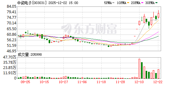 证券时报·数据宝统计,截至发稿,中瓷电子收盘价为78.24元,上涨6.62%,本期筹码集中以来股价累 计上涨8.91%。具体到各交易日,4次上涨,4次下跌,其中,涨停1次。 中瓷电子12月22日披露,截至12月20日公司股东户数为25549户,较上期(12月10日)减少5696户,环 比降幅为18.23%。 融资融券数据显示,该股最新(12月19日)两融余额为4.77亿元,其中,融资余额为4.70亿元,本期筹 码集中以来融资余额合计减少4448.67万元,降幅为8.65%。 公司发布的三季报数据显示,前三季公司共实现营业收入21.43亿元,同比增长13.62%,实现净利润 4.43亿元,同比增长20.07%,基本每股收益为0.9800元,加权平均净资产收益率7.15%。(数据宝) (文章来源:证券时报网) ...