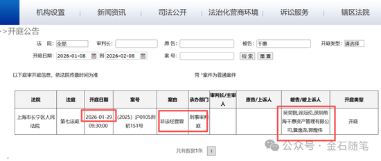 公司是一家量化大厂,管理规模高达50-100亿规模。公司董事长是陈立玺,曾是衍生品交易分析师,在 美银美林、中信里昂有着丰富的衍生品研究经验,16年6月担任公司总经理,24年8月开始担任董事长。 值得注意的是,和千惠资本一同列为被告的还有4人:吴奕皝、徐冠伦、詹逸龙、郭煌伟。其中,吴奕 皝是该私募前董事长,24年8月刚卸任,其他3人为公司专业从业人员。 炒股就看金麒麟分析师研报,权威,专业,及时,全面,助您挖掘潜力主题机会! 来源:金石杂谈 1月8日消息,金石杂谈查询上海开庭公告发现,知名百亿量化私募深圳前海千惠资产管理有限公司(简 称"千惠资产")及相关成员因非法经营罪被起诉,开庭时间定在2026年1月29日。 另据上海证券报采访知情人士,千惠资产2024年上半年便有员工被带走调查,原因大概率是"融券分 仓"问题。"事由可能是利用公司基金产品从证券公司融券,并通过分仓软件交由外部T0交易团队交易, 即存在将融来的证券二次贩卖的行为。不过此次被起诉事由如何不得而知。" 金石随笔查询协会官网发现,千惠资产,成立于2016年3月,2017年6月进行了登记。业务类型:私募证 券投资基金,主要面对的是二级市场业务。 ...