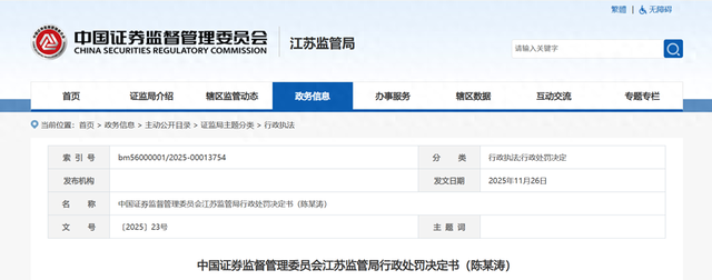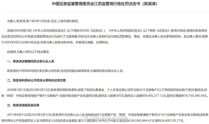 江苏证监局:券商副总裁陈某涛违规买卖证券被罚没1.35亿