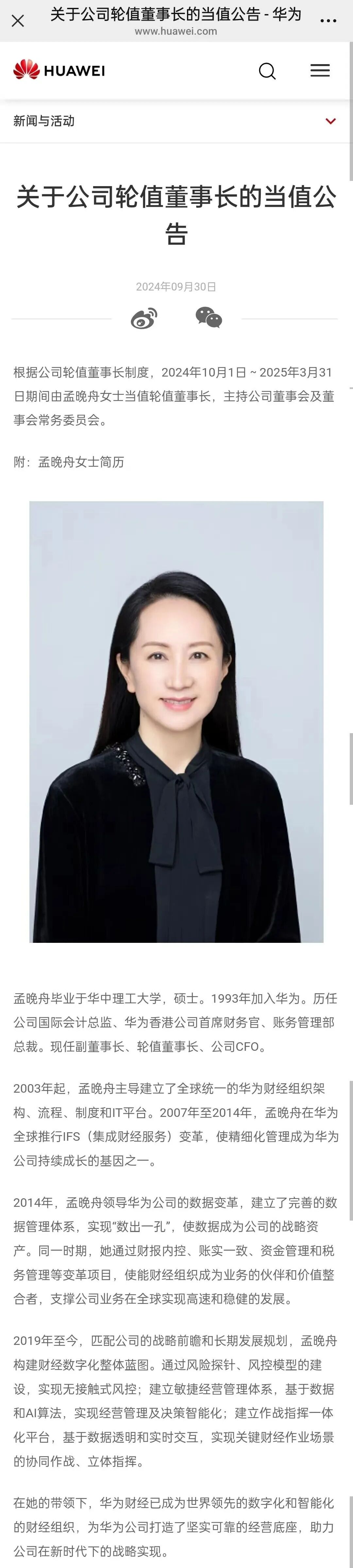 9 月 30 日,华为公司网站发布消息,根据公司轮值董事长制度,2025 年 10 月 1 日~2026 年 3 月 31 日期间由孟晚舟女士当值轮值董事长,主持公司董事会及董事会常务委员会。 推荐阅读 点击标题可跳转 1、 深圳企业纳税 10 强:腾讯 592 亿真·遥遥领先。网友:华为居然没进前五? 2、 突发!特朗普要求微软解雇一总裁 附:孟晚舟简历 孟晚舟毕业于华中理工大学,硕士。1993 年加入华为。历任公司国际会计总监、华为香港公司首席财 务官、账务管理部总裁。现任副董事长、轮值董事长、公司 CFO。 2003 年起,孟晚舟主导建立了全球统一的华为财经组织架构、流程、制度和 IT 平台。2007 年至 2014 年,孟晚舟在华为全球推行 IFS(集成财经服务)变革,使精细化管理成为华为公司持续成长的基因之 一。 2014 年,孟晚舟领导华为公司的数据变革,建立了完善的数据管理体系,实现"数出一孔",使数据成 为公司的战略资产。同一时期,她通过财报内控、账实一致、资金管理和税务管理等变革项目,使能财 经组织成为业务的伙伴和价值整合者,支撑公司业务在全球实现高速和稳健的发展。 2019 年至今,匹配公 ...