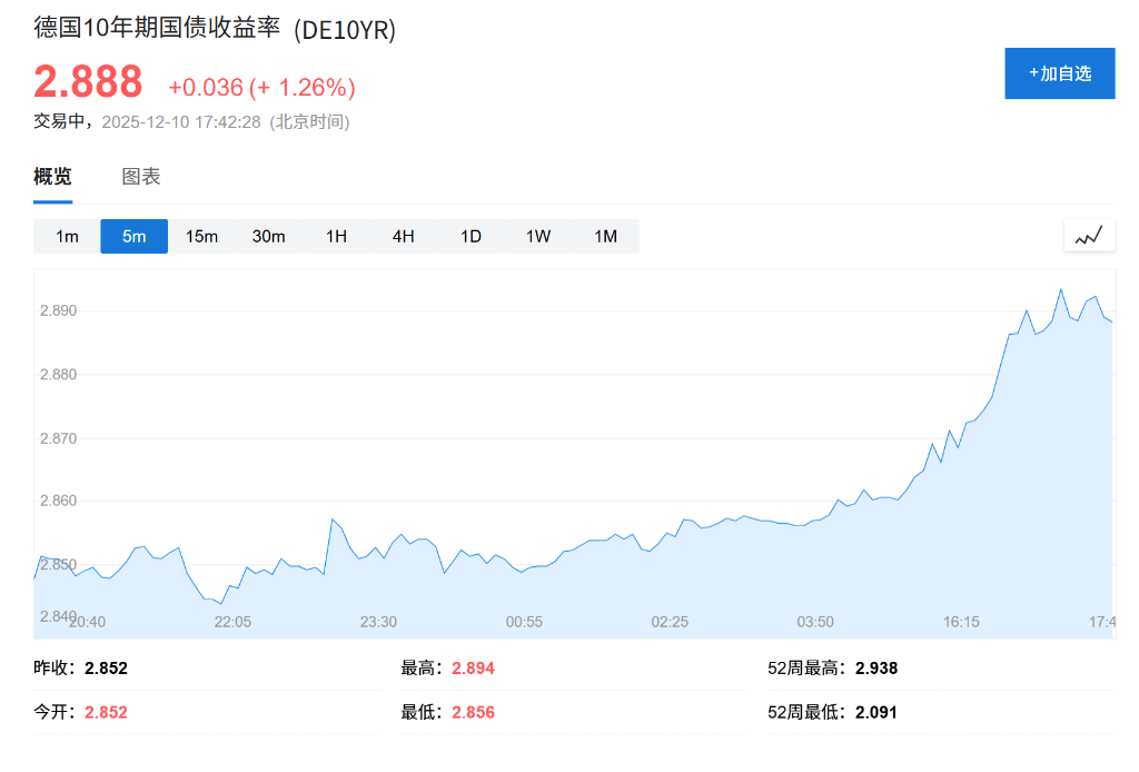 货币市场对欧洲央行货币政策立场的预期正在发生显著转变,交易员目前预计该行在2026年底前加息的概率已达到50%。 根据掉期市场数据,交易员目前预计2026年12月底前加息幅度为12.5个基点,较本周二的7个基点显著上升。这一预期的快速调整源于欧洲央行执 委Isabel Schnabel本周早些时候发表的鹰派言论,促使市场重新评估政策路径。 值得注意的是,交易员已完全排除2026年降息的可能性。这标志着市场预期的根本性转变,此前市场普遍预期欧洲央行将延续宽松政策路径。当 前的定价显示,投资者认为欧洲央行更可能维持甚至收紧货币政策,而非进一步放松。 这一预期转变对欧洲债券市场产生了直接冲击。德国国债价格下跌,收益率曲线中段领跌,其中5年期收益率上涨5个基点至2.52%。10年期收益 率上涨3.6个基点至2.88%。 风险提示及免责条款 市场有风险,投资需谨慎。本文不构成个人投资建议,也未考虑到个别用户特殊的投资目标、财务状况或需要。用户应考虑本文中的任何意见、观点或结论是否符合其特定状况。据此投资,责 任自负。 ...