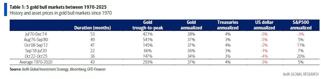 Hartnett在上周的报告中指出,"太热"的贵金属市场经历了一轮调整,黄金未能突破4000美元,白银也在50美元附近承压,主要原因是做空美元交易的回 补。他认为这种调整为后续的上涨创造了更好的入场机会。 该策略师强调,美联储政策变化预期、政府刺激政策,以及可能到来的黄金重估(类似1934年和1973年)都将支撑货币贬值交易。 基于过去四轮牛市的历史数据,Hartnett计算出黄金平均涨幅约为300%,持续时间为43个月,据此推算黄金价格明年春季可能达到6000美元的峰值水平,这 需要投资者增加28%的购买量。 美银首席投资策略师Michael Hartnett表示,货币贬值交易的长期前景依然看好,他预计基于历史牛市表现,黄金价格有望在明年春季冲击6000美元。 美银数据显示,黄金在机构和私人客户资产配置中的占比仍然偏低,分别仅为2.3%和0.5%,这表明市场对黄金的结构性多头配置并不拥挤。 Hartnett认为,当前的配置不足状态与黄金的长期投资价值形成鲜明对比,为那些提前布局的投资者提供了潜在机会。 政策预期与历史重估支撑长期趋势 推动黄金长期上涨的因素包括对新任美联储主席的提前布局、繁荣泡沫政策的实施, ...