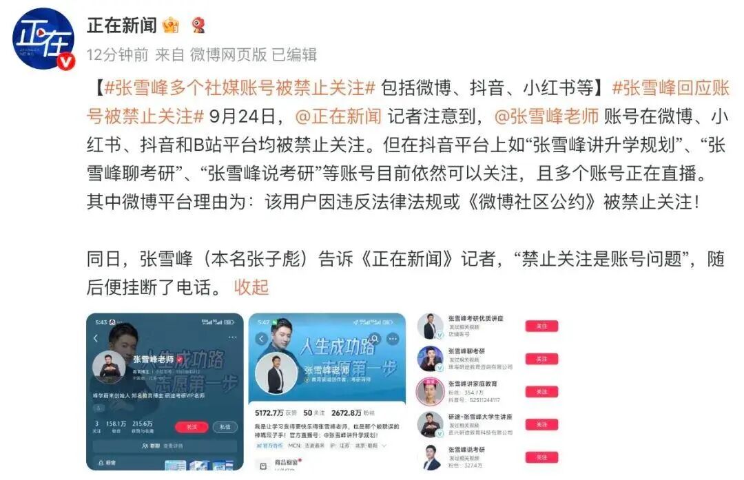 (来源:评论员毕舸) 2025年9月24日,张雪峰的名字再次冲上热搜,不是因为他又说了什么惊世骇俗的话,而是其在微博、小红书、抖音、B站等多个主流社交平台的账号, 集体被禁止关注。 不是个别平台的限流,也不是技术故障,而是清一色的"被禁止关注"。其中微博明确标注理由:该用户因违反法律法规或《微博社区公约》被禁止关注。 这事不寻常。多平台统一行动,说明张雪峰已经不再是"有争议的老师",而是一个被认定具有社会动员潜力的"高危变量"。 他的言论不再只是个人观点,而是被视作可能影响公共秩序的导火索。这次封禁,不针对某一条视频、某一场直播,是对其整个内容生态的否定。 面对记者的追问,张雪峰只回了九个字:"禁止关注是账号问题。"说完就挂了电话。 | 看来素来口若悬河的张导师,这次也真是没话说了。 | | --- | | 这么多年来,张创办峰学未来,搞直播电商,卖高考志愿卡,动辄上万,靠的就是这些账号引流变现。 | | 现在说"是账号问题",仿佛自己只是个无辜的旁观者,账号自己长腿跑去违规了? | | 五个账号,粉丝千万,一夜被封,说明有更高层的力量在发力,难怪张无话可说。 | | 这可能就是所谓的"爆点"吧。 | | 一 ...
