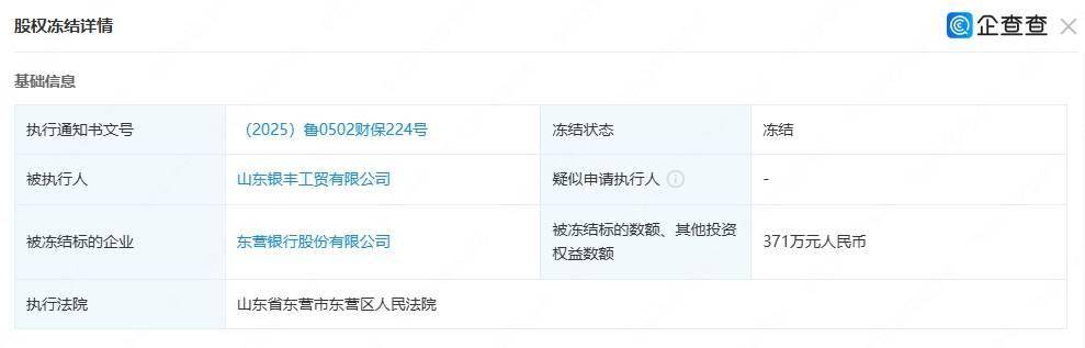 东营银行371万股权突遭冻结,第二大股东涉1.14亿被执行款