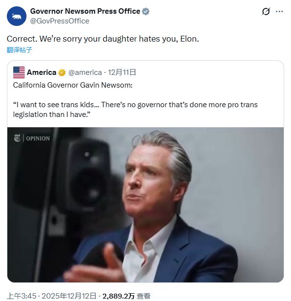 加州州长“你女儿恨你,埃隆”,马斯克回怼:那是我儿子