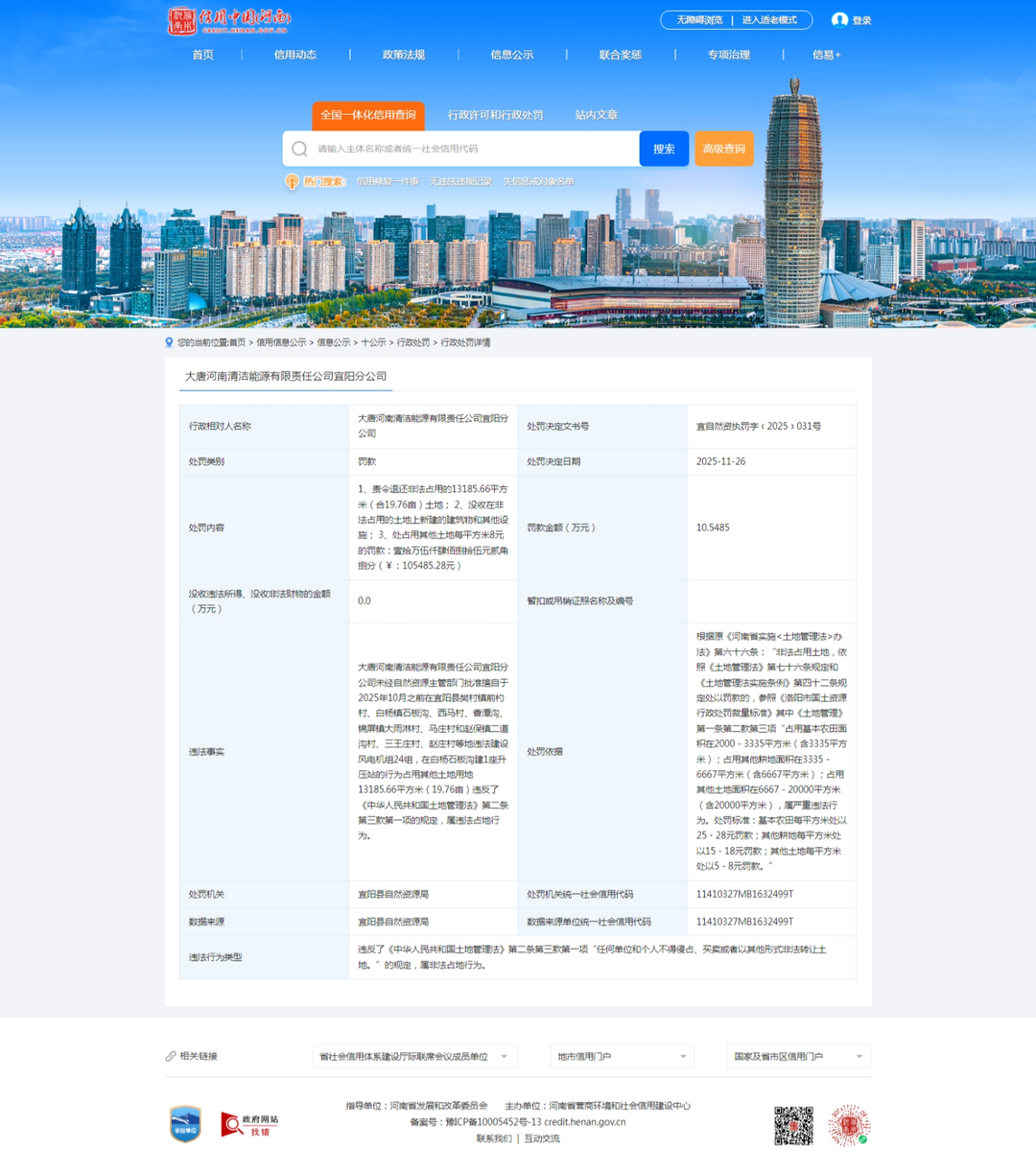 行政处罚事件概述 - 大唐河南清洁能源有限责任公司宜阳分公司因违法占地行为受到行政处罚 处罚决定日期为2025年11月26日 处罚机关为宜阳县自然资源局 [1] - 行政处罚决定书文号为宜自然资执罚字(2025)031号 [2][3] 违法事实详情 - 公司在未经自然资源主管部门批准的情况下 于2025年10月之前在宜阳县多个村镇违法建设风电机组24组及1座升压站 [2] - 具体违法建设地点涉及樊村镇前杓村 白杨镇石板沟 西马村 香潭沟 锦屏镇大雨淋村 马庄村和赵保镇二道沟村 三王庄村 赵庄村等地 [2] - 上述行为非法占用其他土地共计13185.66平方米 折合19.76亩 [2][3] 行政处罚具体内容 - 责令退还非法占用的13185.66平方米(19.76亩)土地 [2][3] - 没收在非法占用的土地上新建的建筑物和其他设施 [2][3] - 处以罚款 按占用其他土地每平方米8元的标准计算 罚款总额为105485.28元(约10.55万元) [2][3] 处罚依据与违法性质认定 - 公司的行为违反了《中华人民共和国土地管理法》第二条第三款第一项关于禁止非法占用土地的规定 [2] - 根据《河南省实施<土地管理法>办法》第六十六条及《洛阳市国土资源行政处罚裁量标准》 此次非法占用其他土地面积在6667至20000平方米范围内 被认定为严重违法行为 [2] 公司背景信息 - 大唐河南清洁能源有限责任公司宜阳分公司成立于2018年 负责人为秦烈中 [5] - 其母公司大唐河南清洁能源有限责任公司成立于2014年10月 注册资本为110337.56万元人民币 法定代表人同为秦烈中 [3][5] - 大唐河南清洁能源有限责任公司由大唐河南发电有限公司全资持股 隶属于中国大唐集团 [3][5] - 该公司是为加快清洁能源开发而设立的平台 主要从事风电开发 建设与运营 风电场分布于三门峡 平顶山 洛阳等地 [3]
