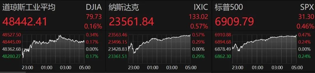 上天天基金APP搜索777注册即可领500元券包,优选基金10元起投!限量发放!先到先得! 大型科技股多数上涨 ,英伟达涨超3%,谷歌、亚马逊涨超1%,Meta、苹果、微软、奈飞小幅上 涨;特斯拉、英特尔小幅下跌。 中概股方面,纳斯达克中国金龙指数收跌0.58%。小马智行跌3%,蔚来跌超2%,哔哩哔哩跌近 1%;阿里巴巴微涨。 国际金银持续拉升,续创历史新高,12月24日亚洲早盘, 现货黄金走高首次升破4500美元/盎司关 口 。 隔夜美股盘中拉升。12月24日黄金高开再创新高。关于美联储未来降息,传来大消息,特朗普也表 态。 | 道琼斯工业平均 | | | DJIA | 纳斯达克 | | | IXIC | 标普500 | | | SPX | | --- | --- | --- | --- | --- | --- | --- | --- | --- | --- | --- | --- | | 48442.41 | | | 79.73 | 23561.84 | | | 133.02 | 6909.79 | | | 31.30 | | | | | 0.16% | | | | 0.57% | | | | 0.46% ...