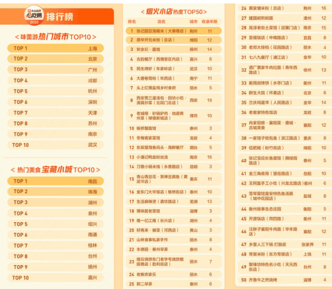 东方网记者程琦10月5日报道:今年国庆黄金周,以美食为导向的"味蕾游"和注重沉浸式体验的"本地深 度游"成为众多消费者的首选,传统"打卡式"出行逐渐降温。各大平台数据显示,假期首日市场即迎 来"开门红",其中餐饮和本地玩乐项目的订单量增幅尤为突出。 大众点评发布的国庆首日寻味数据显示,该平台"必吃榜"的整体流量较上月增长近两倍。其中,接地气 的市井小店和历史悠久的老店成为最大受益者。上榜小店的线上流量增幅超过125%,订单量激增超 178%;而上榜老店的流量和订单量增幅更是分别达到了130%和190%以上。 除了满足味蕾,越来越多的游客开始追求像本地人一样的深度体验。数据显示,10月1日,大众点评"必 玩榜"的异地用户流量环比增长了216%,上榜玩乐项目的订单量增幅超过167%。上海、北京、深圳等 城市成为休闲玩乐的热点,洗浴汗蒸、酒吧、密室逃脱等成为游客热衷的体验项目。 | 必吃帽 排行榜 | | < 烟火川店热度TOP50> | | | 26 黄家塘米粉(总店) | 刷州 | 16 12 | | --- | --- | --- | --- | --- | --- | --- | --- | | 2025 ...