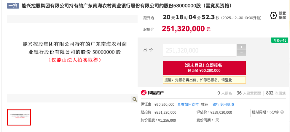智通财经记者 | 曾令俊 上市计划中止两个多月后,广东南海农商行大额股权再现法拍平台。 阿里资产司法拍卖平台,12月30日,能兴集团持有的广东南海商业银行5800万股、700万股股份将进行公开拍卖,起拍价合计2.82亿元,较 估值折价30%。 据了解,此次拍卖评估单价6.19元/股,较2024的评估价6.7元/股有所下降,起拍价折合4.33元/股,远低于南海农商行2025年三季度末7.04元 的每股净资产。 "上市银行股价破发已成为常态,未上市银行股权拍卖价持续低于净资产是很常见的情况,往往大幅低于最新一期的净资产才能成交。"某 券商投行人士告诉智通财经记者。 这两笔股权均为法人股,仅限在佛山市注册的具备法人资格的机构参与竞拍,并需满足财务状况良好、最近2个会计年度连续盈利等一系列 条件。 在2024年12月之前,能兴控股曾是南海农商行第二大股东,持股比例达到5.29%。但能兴集团的房地产主业受到行业深度调整的冲击。2023 年,该集团出现4.58亿元的亏损,旗下资产相继被司法冻结,法定代表人也被列为被执行人。 第一次尝试在2024年10月,能兴控股持有的约9387万股南海农商行股份被挂出拍卖,评估价值约6. ...