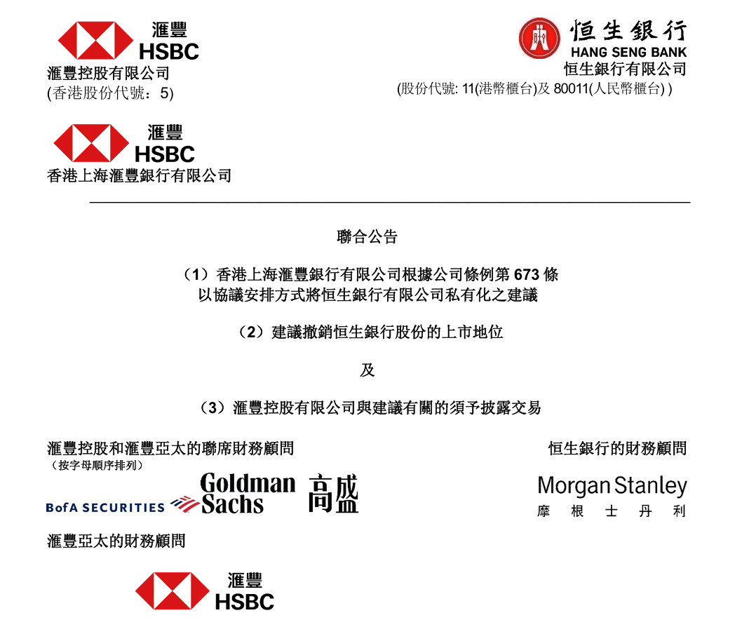 2025.10.09 本文字数:2633,阅读时长大约4分钟 作者 |第一财经 李隽 在香港的地铁站跟朋友见面,应该如何选择地点?一些香港本地人的通常做法是:在恒生银行 (00011.HK)柜员机旁边。 作为香港最大的本土银行之一,恒生银行可能即将退市。这家市值3000亿港元的香港本地银行,将被母 公司汇丰控股(00005.HK)私有化。 10月9日早上,恒生银行、汇丰控股联合公告称,建议撤销恒生银行股份的上市地位,私有化价格为155 港元/股。9日上午,恒生银行大涨26.3%,中午报收150.3港元,汇丰控股跌6.24%,报收103.7港元。 公开资料显示,汇丰控股在恒生银行持股比例超过63%,私有化可能花费上千亿港元现金。该公司汇宣 布,未来三个季度不再回购自身股份。 业内人士认为,恒生银行依然有部分地产方不良资产需要消化,私有化之后,汇丰控股要承担这部分责 任,这是两者股价表现差异的原因之一;展望未来,协同效应还有进一步再提升的空间,符合现在汇丰 内部改革的总体思路。 每股155港元现金付款 据此测算,此次现金私有化可能花费汇丰控股上千亿港元现金,交易估值也远高于同行业。业内人士向 第一财经记者分析,在 ...