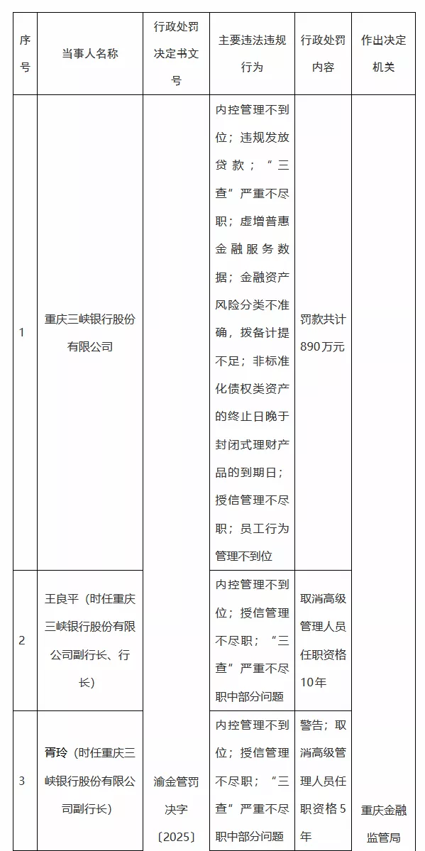 同时,时任重庆三峡银行行长、董事长丁世录被禁止终身从事银行业工作;时任重庆三峡银行计划财务 部副总经理、结算运营部总经理刘鸣昊被禁止终身从事银行业工作;时任重庆三峡银行副行长、行长王 良平被取消高级管理人员任职资格10年;时任重庆三峡银行副行长胥玲被警告,并取消高级管理人员任 职资格5年;时任重庆三峡银行信贷管理部副总经理王身忠、两江支行行长邱信朝被警告并罚款5万元; 时任重庆三峡银行授信评审部副总经理邹陶、授信评审部公司评审中心经理谢瑞宝被警告。 近日,国家金融监督管理总局重庆监管局披露的行政处罚信息显示,重庆三峡银行股份有限公司因存在 以下违法违规行为:内控管理不到位;违规发放贷款;"三查"严重不尽职;虚增普惠金融服务数据;金 融资产风险分类不准确,拨备计提不足;非标准化债权类资产的终止日晚于封闭式理财产品的到期日; 授信管理不尽职;员工行为管理不到位,被罚款共计890万元。 | 序 | | 行政处罚 | 主要违法违规 | 行政处罚 | 作出决定 | | --- | --- | --- | --- | --- | --- | | 를 | 当事人名称 | 决定书文 | 行为 | 内容 | 机关 | | | ...