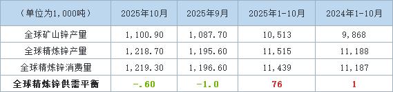 | (单位为1,000吨) | 2025年10月 | 2025年9月 | 2025年1-10月 | 2024年1-10月 | | --- | --- | --- | --- | --- | | 全球矿山锌产里 | 1,100.90 | 1,087.70 | 10, 513 | 9,868 | | 全球精炼锌产里 | 1, 218. 70 | 1, 195. 60 | 11,515 | 11, 188 | | 全球精炼锌消费里 | 1, 219. 30 | 1, 196. 60 | 11, 439 | 11, 187 | | 全球精炼锌供需平衡 | -. 60 | -1.0 | 76 | 1 | 以下为详细数据(单位:千吨) 国际铅锌研究小组(ILZSG)公布的最新月度报告显示,2025年10月全球精炼锌消费量为121.93万吨,9月 为119.66万吨。2025年1-10月全球精炼锌消费量为1143.9万吨,上年同期为1118.7万吨。 2025年10月全球锌市为供应短缺0.06万吨,9月为供应短缺0.10万吨。2025年1-10月全球锌市为供应过剩 7.6万吨,上年同期为供应过剩0.1万吨。 ...