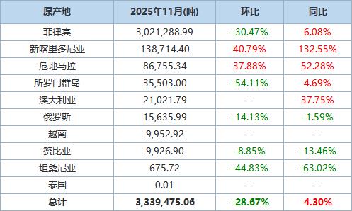 海关统计数据在线查询平台公布的数据显示,中国2025年11月镍矿砂及其精矿进口量为3,339,475.06 吨,环比减少28.67%,同比上升4.30%。 以下为根据中国海关总署官网数据整理的2025年11月镍矿砂及其精矿进口分项数据一览表: | 原产地 | 2025年11月(吨) | 环比 | 同比 | | --- | --- | --- | --- | | 菲律宾 | 3.021.288.99 | -30.47% | 6.08% | | 新喀里多尼亚 | 138.714.40 | 40.79% | 132.55% | | 危地马拉 | 86.755.34 | 37.88% | 52.28% | | 所罗门群岛 | 35.503.00 | -54.11% | 4.69% | | 澳大利亚 | 21,021.79 | -- | 37.75% | | 俄罗斯 | 15.635.99 | -14.13% | -1.59% | | 越南 | 9.952.92 | | | | 赞比亚 | 9,926.90 | -8.85% | -13.46% | | | 675.72 | -44.83% | -63.02% | | ...