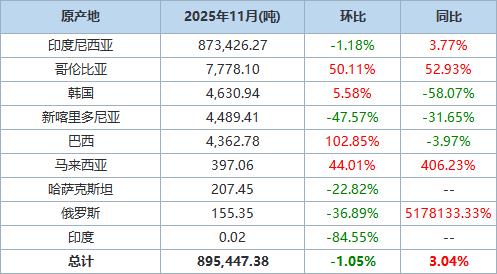 中国2025年10月镍铁进口总量 - 2025年10月镍铁进口总量为905,144.28吨,环比下降16.60%,但同比增长31.72% [1] 主要进口来源地分析 - 印度尼西亚是绝对主导的进口来源地,10月进口量为884,038.43吨,占总进口量的绝大部分,环比下降16.22%,同比增长32.87% [1] - 新喀里多尼亚为第二大进口来源地,10月进口量为8,562.48吨,环比增长13.37%,同比增长51.52% [1] - 从哥伦比亚进口5,181.70吨,环比大幅下降33.96%,同比增长12.79% [1] - 从韩国进口4,386.31吨,环比下降14.04%,同比大幅下降39.58% [1] 其他来源地进口变动 - 从未明确指明的“田”地区进口2,150.70吨,环比急剧下降76.09%,同比下降47.19% [1] - 从未明确指明的“三来西亚”地区进口275.71吨,环比暴增415.13%,同比增长91.80% [1] - 从哈萨克斯坦进口268.77吨,环比增长16.04% [1] - 从俄罗斯进口246.16吨,环比下降27.14% [1] - 从日本进口33.91吨 [1] - 从印度进口量仅为0.12吨,同比大幅下降99.90% [1] - 进口总量数据包含表格中未完全列出的其他原产地数据 [2]