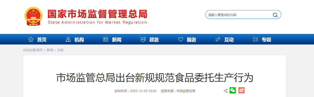 12月29日,市场监管总局制定出台《食品委托生产监督管理办法》(以下简称《办法》),进一步压实 委托双方责任,规范食品委托生产行为,着力防范食品安全风险。《办法》自2026年12月1日起施行。 "贴牌"生产、加工的合作将实现全过程管控。《办法》清晰界定委托生产范围。明确食品委托生产为受 托方按照委托方的要求,从事食品的全部或者部分环节的生产活动,并交付所生产食品的行为。将采取 商标许可、特许经营、来料加工、贴牌生产等方式委托生产食品的行为,均纳入监管范围。 《办法》明确了委托双方资质要求。规定委托方必须取得食品生产经营许可证或进行仅销售预包装食品 备案、必须具备对受托方生产行为进行监督的能力、能够正常履行食品安全主体责任,不具备规定资质 能力的市场主体不得委托生产。受托方必须依法取得相应类别的食品生产许可,同时具备相应的生产能 力和食品安全保障能力,不得超出许可范围、生产能力接受委托。 《办法》要求,细化委托双方责任义务。细化委托双方在资质查验、原料查验、标签标识、食品安全自 查、检验留样、召回等方面的食品安全责任。要求委托方建立食品安全管理制度,配备食品安全管理人 员,对受托方实施监督;受托方对生产行为负责 ...