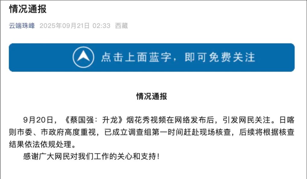 西藏"云端珠峰"微信公众号9月21日凌晨发布情况通报:9月20日,《蔡国强:升龙》烟花秀视频在网络发布后,引发网民关注。日喀则市委、市 政府高度重视,已成立调查组第一时间赶赴现场核查,后续将根据核查结果依法依规处理。 9月21日早晨8点左右, @ARCTERYX始祖鸟发文道歉: 致歉信 近期品牌赞助的蔡国强 —— 《升龙》艺术项目引发了广泛的公众讨论,我们衷心感 谢大家对青藏高原生态环境的关切与监督,并诚恳接受所有的批评和建议。大家的守护, 我们深表认同与尊重。在此,向各位表达最真挚的歉意。 该项目本是希望通过艺术家的创作,提升对高山在地文化的关注。尽管怀揣这样的初 心,在作品呈现过程中仍出现偏差甚至偏离。大家的肺腑之言让我们警醒:对艺术表达边 界的评估需要更加专业,对自然的敬畏需要更加谦卑。 我们深知仅仅道歉是远远不够的,我们有责任在政府部门监管下,配合艺术家团队对 该项目全过程的环境生态影响进行复核,邀请第三方专业环保机构,开展严谨而透明的评 估工作。我们承诺:将依据评估结果与社会各界的反馈,展开及时有效的补救行动。同 时,我们将加快推进既定的藏地环境保护计划,并全力推动有助于当地文化发展的公益项 目。 ...