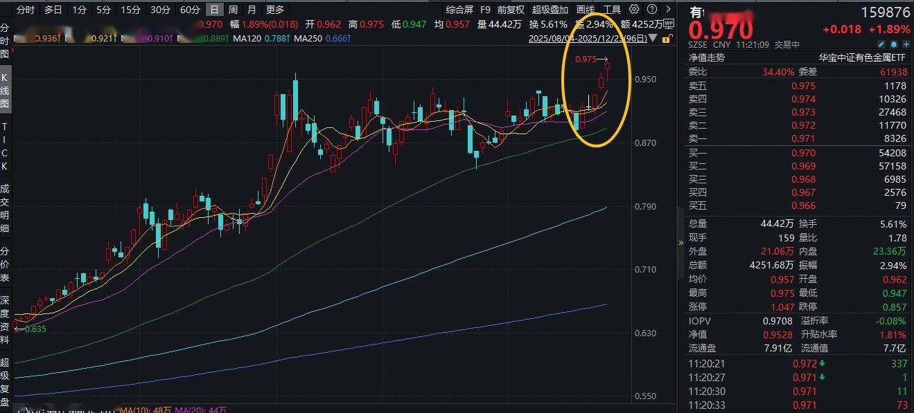 炒股就看金麒麟分析师研报,权威,专业,及时,全面,助您挖掘潜力主题机会! 12月23日早盘,有色金属板块领涨两市,同标的指数规模最大的有色ETF华宝(159876)场内价格盘中 涨超2.3%,现涨1.89%,刷新ETF上市以来的高点! 拉长时间来看,有色ETF华宝(159876)自本轮低点(4月8日)以来,累计上涨89.68%,大幅跑赢沪指 (26.51%)、沪深300(28.48%)等主要指数。 数据来源:中证指数公司、沪深交易所等,统计区间:2025.4.8-2025.12.22。注:中证有色金属指数近5 个完整年度的涨跌幅为: 2020年,35.84%;2021年,35.89%;2022年,-19.22%;2023年,-10.43%; 2024年,2.96%,指数成份股构成根据该指数编制规则适时调整,其回测历史业绩不预示指数未来表 现。 成份股方面,博威合金、山东黄金领涨超8%,云南锗业涨逾6%,南山铝业、厦门钨业、盛新锂能涨超 5%。权重股方面,洛阳钼业涨超2%,中国铝业涨逾1%,紫金矿业飘红。 图:有色龙头ETF标的指数涨幅前十大成份股 | 序号 | 名称 | 品供価 ▼ | 两日图 | 申万一级行 ...