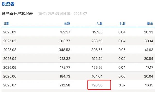 7月A股新开户数据出炉。 8月4日,上交所发布的新开户数据显示,今年7月A股新开户数达196.36万户,较今年6月的新开户数环 比增长19%,同比增长71%,新开户数远超去年同期水平。去年7月A股新开户数则为115.14万户。 | 日期 | 总数 | A股 | B股 | 基金 | | --- | --- | --- | --- | --- | | 2025.01 | 177.37 | 157.00 | 0.04 | 20.33 | | 2025.02 | 313.77 | 283.59 | 0.04 | 30.14 | | 2025.03 | 348.53 | 306.55 | 0.05 | 41.93 | | 2025.04 | 213.32 | 192.44 | 0.04 | 20.84 | | 2025.05 | 172.77 | 155.56 | 0.04 | 17.17 | | 2025.06 | 184.73 | 164.64 | 0.06 | 20.04 | | 2025.07 | 212.58 | 196.36 | 0.07 | 16.15 | 从两融数据来看,今年7月两融规模总体也呈现走高之 ...
