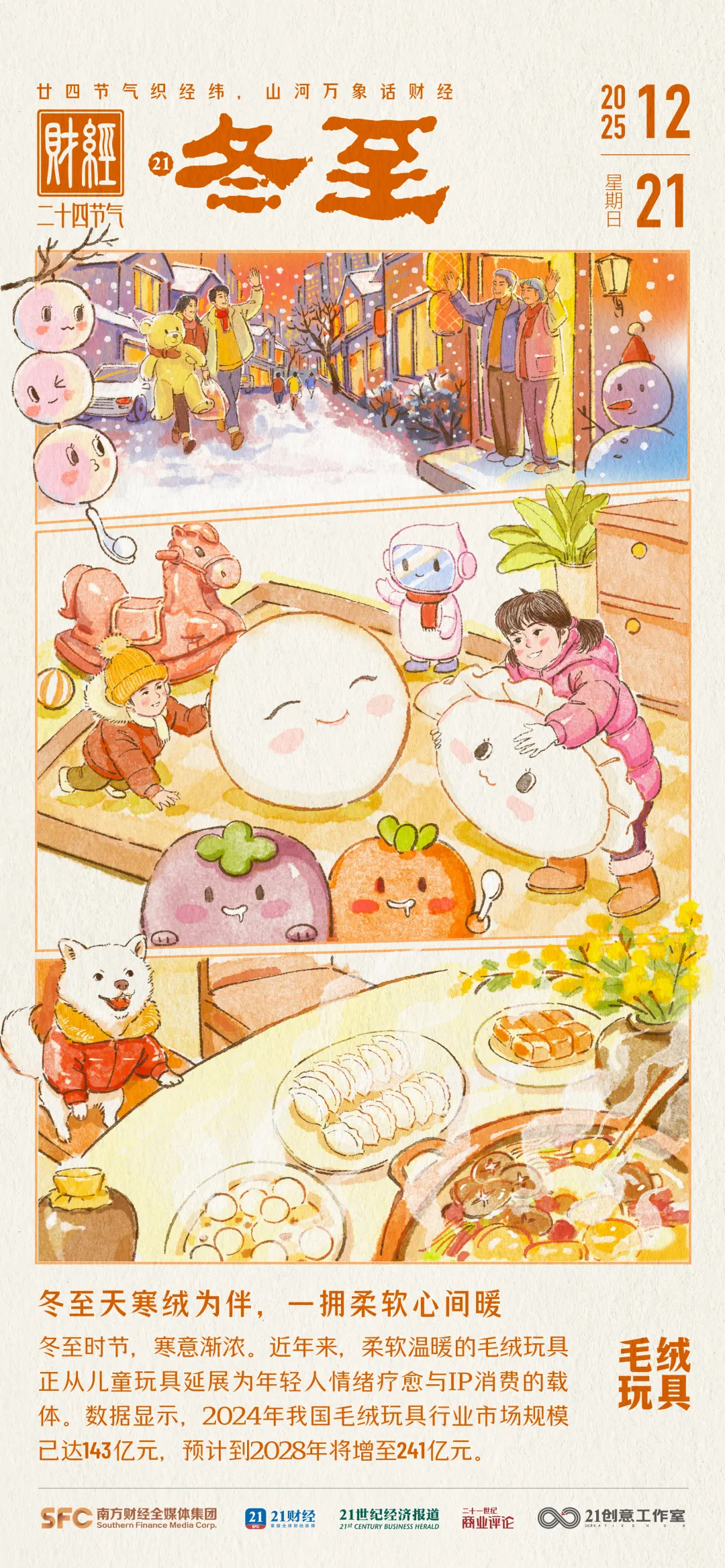 今日冬至(2025年12月21日),寒意渐浓,人们对温暖与陪伴的需求愈发凸显。近年来,毛绒玩具正从传统玩具演变为承载情绪价值与社交属性的消费新 载体。华经产业研究院发布的报告显示,2024年我国毛绒玩具行业市场规模已达143亿元,预计到2028年将增长至241亿元。 为什么越来越多人愿意为毛绒公仔买单?明星IP加持下,毛绒玩具撬动了怎样的大市场?当毛绒玩具遇上AI,又将带来哪些新变化?本期《财经二十四节 气》带你看。 01 毛绒玩具赛道火热 小公仔撑起大产业 "毛绒绒"到底有多火?从社交平台的热度可见一斑:在小红书,"毛绒玩具"相关话题浏览量已达22.1亿次;在抖音,话题播放量更是高达180.1亿次。 消费端的火热同样直观。天猫毛绒公仔热卖榜上,自嘲熊等知名IP毛绒产品持续热销;泡泡玛特旗下IP Hirono小野、SKULLPANDA的毛绒公仔同样表现 不俗;而今年的一匹"黑马"——五月天主唱阿信共创品牌STAYREAL旗下IP"卜卜"(全名"魔魔胡胡胡萝卜")毛绒公仔,截至12月18日已连续三周蝉联热 销榜榜首。 广东省玩具协会《2025 年度毛绒玩具产业发展报告》数据显示,2024年全球毛绒玩具市场规模突 ...
