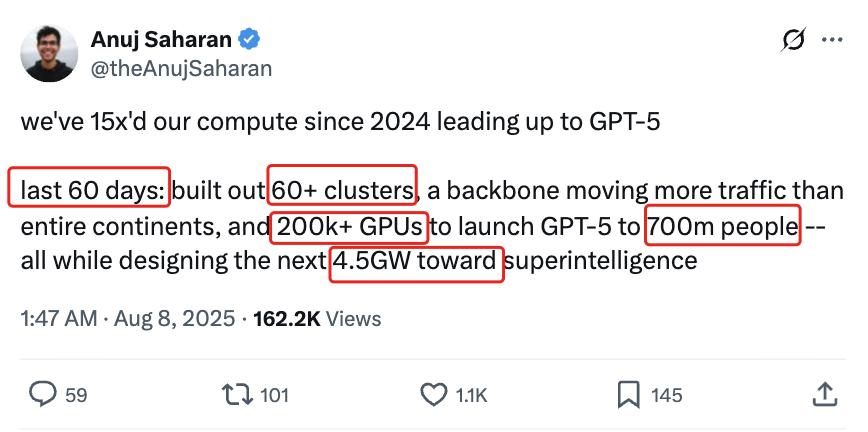 智东西9月22日报道,据《华尔街日报》、《经济学人》等多家外媒记者报道,美国正经历AI数据中心的支出狂潮,2025年支出或达5200 亿美元(约合3.7万亿元人民币),规模超过互联网时代电信支出峰值、接近铁路支出峰值。 这短期对经济带来了重大提振作用,但也导致其他重要领域资金匮乏,从而为之后带来前所未有的负面作用,甚至吞噬美国经济。 上个月刚刚降世的GPT-5背后也是巨量算力投资。OpenAI研究员Anuj Saharan在社交媒体X上说:"自2024年开始研发GPT-5以来,我们的计 算能力已增长了15倍。过去60天里,我们构建了60多个集群、传输流量超过整个美国大陆的主干网以及20万多块GPU,以便将GPT-5推向7 亿人——同时设计下一个4.5GW超级智能(中心)。"近期,OpenAI还被曝出计划在印度建设至少1GW规模的数据中心,以推动其Stargate (星际之门)项目扩张。 OpenAI研究员Anuj Saharan的发文截图 实际上,美国AI基础设施投资总量巨大,已经起到了提振美国GDP(国民生产总值)的作用。 据《华尔街日报》记者克里斯托弗·米姆斯(Christopher Mims)8月4日报 ...