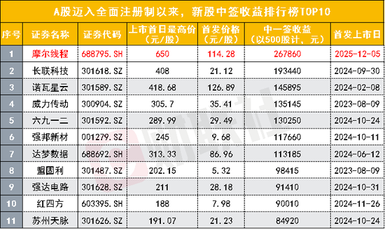 公司主要从事GPU及相关产品的研发、设计和销售,本次募集资金总额近80亿元,主要投向新一代自主 可控AI训推一体芯片研发项目、新一代自主可控图形芯片研发项目、新一代自主可控AISoC芯片研发项 目以及补充流动资金。 | N摩尔-U(688795) 12-05 09:26:06 沪 科 融 成 | | | 8 Q | | --- | --- | --- | --- | | 650.00 Ellis --- | | | 查看所属板块 > | | +535.72 +468.78% | | | | | 今 开 | 650.00 最 高 | 650.00 成交量 | 2.24万手 | | 昨 收 | 114.28 最 低 | 650.00 成交额 | 14.5亿 | | 市盈® | -316.70 换手率 | 7.61% 总市值 | 3055亿 ▲ | 炒股就看金麒麟分析师研报,权威,专业,及时,全面,助您挖掘潜力主题机会! 来源:智通财经 摩尔线程竞价高开468%,总市值近3055亿,股价报650元,中一签盈利近27万元。 | | | | | A股迈入全面注册制以来,新股中签收益排行榜IOP10 | | | | -- ...