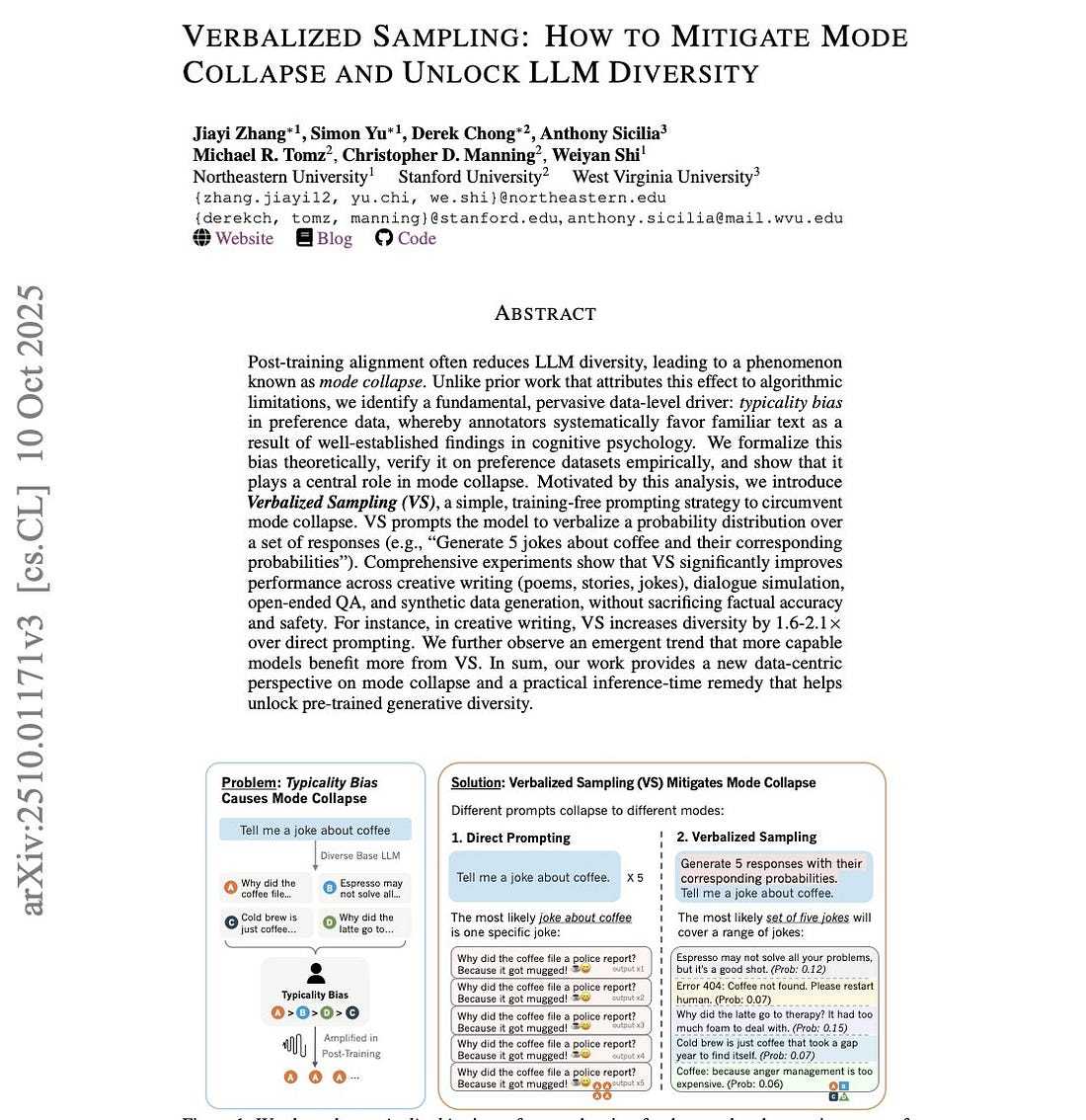 文章核心观点 - 斯坦福大学等机构的研究发现,通过一种名为“言语化采样”的简单提示词技术,无需重新训练或微调模型,即可显著解锁大型语言模型被“安全对齐”过程所抑制的创造力,使答案多样性提升高达2倍[5][6][27] AI模型创造力受限的根源 - 后训练阶段的安全对齐过程导致了“模式坍缩”,使得模型在创意任务中总是输出最刻板、最安全、最无聊的回答[12] - 根本原因并非算法永久性损伤,而是人类标注员在训练过程中存在系统性认知偏差,导致模型被训练得迎合人类对“典型”答案的偏好[13][14] - 人类偏好评分数据显示,典型性偏差权重 α 达到 0.57±0.07 (p<10^-14),表明偏差影响显著[14] “言语化采样”技术的原理与效果 - 技术核心是改变提问方式,从要求“一个”答案变为要求生成多个答案并附带其概率,例如“生成5个关于咖啡的笑话并给出概率”[15][16] - 该方法迫使模型从预训练学到的真实概率分布中随机采样,而非仅输出坍缩后分布中最典型的答案[16] - 应用该技术后,对于具有多种有效视角的问题,答案多样性增加了1.9倍;在诗歌、故事、笑话等任务上,多样性增加了1.6–2.1倍[23][27] - 基础模型的创造力恢复率达到66.8%,而未使用该技术时仅为23.8%[27] - 人类偏好评分提高了25.7%(基于2,700次评分测试),且模型回答更像人类,机械感减少[27] 技术的应用方法与场景 - **通用方法**:在任何聊天机器人中,使用包含生成多个带概率回答的指令的提示词[17] - **专业方法**:在系统提示词中设定规则,要求模型从概率小于0.10的分布长尾部分随机采样回答,以自动提升创造性[20][21][22] - **开发者工具**:可通过安装Python包 `verbalized-sampling` 在代码中调用该功能[23] - **应用场景**:适用于头脑风暴、内容创作、解决问题、图像生成提示词多样化以及合成数据生成等领域[29][30] - **合成数据效益**:使用该技术生成的训练数据,能使下游任务准确率提高14–28%[24] 技术影响的深层洞察 - 该技术证明,对齐并未永久性抹杀模型的创造力,多样性依然编码在模型权重中,只是某些模式变得不易访问[27][28] - 模型规模越大,从中获益越多,例如GPT-4获得的多样性提升是GPT-4-Mini的2倍,表明更大模型有更多被困的创造力等待解锁[24][25][26] - 该技术改变了行业对AI对齐的认知,证明安全性与创造力并非不可兼得,在事实性问题和常识推理上准确率没有下降,安全性未退化[31][32]