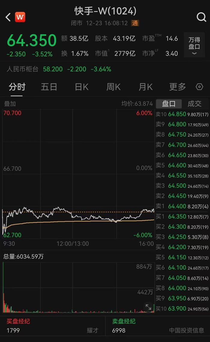 快手-W(01024)12月23日斥资1.74亿港元回购271.76万股