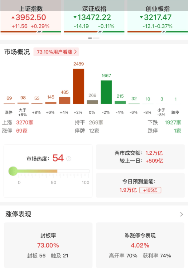 格隆汇12月25日|A股三大指数涨跌不一,截至午间收评,沪指涨0.29%报3952.5点,深证成指跌 0.11%,创业板指跌0.38%,北证50涨1.04%。全市场成交额12119亿元,较上日成交额放量527亿元,超 3200股上涨。盘面上,商业航天板块全线爆发,造纸、军工板块涨幅居前。金银价格昨日破顶后纷纷回 落,有色金属板块集体回调;海南自贸区、饮料制造、元件板块走低。 | 上证指数 | | | 深证成指 | | | | 创业板指 | | | | --- | --- | --- | --- | --- | --- | --- | --- | --- | --- | | -3952.50 | | | -13472.22 | | | | -3217.47 | | | | +11.56 +0.29% | | | -14.19 -0.11% | | | | -12.1-0.37% | | | | 市场概况 73.10%用户看涨 > | | | | | | | | | | | 2489 | | | | | | | | | | | | | | 1667 | | | | | | | | 88 ea | 53 | 485 ...