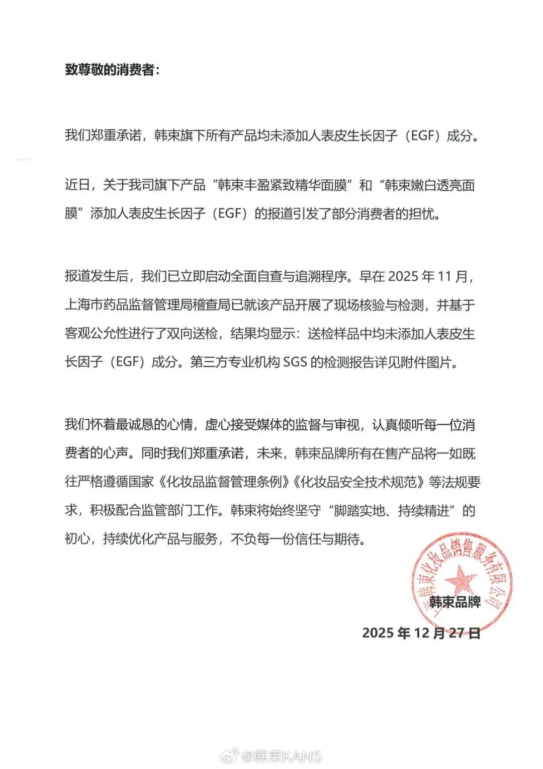 (来源:中国商报) 我们怀着最诚恳的心情,虚心接受媒体的监督与审视,认真倾听每一位消 费者的心声。同时我们郑重承诺,未来,韩束品牌所有在售产品将一如既 往严格遵循国家《化妆品监督管理条例》《化妆品安全技术规范》等法规要 求,积极配合监管部门工作。韩束将始终坚守"脚踏实地、持续精进"的 初心,持续优化产品与服务,不负每一份信任与期待。 2025年12月27日 6 @E FIKANS 转自:中国商报 12月27日,韩束在其官方微博发文承诺,韩束旗下所有产品均未添加人表皮生长因子(EGF)成分。 致尊敬的消费者: 我们郑重承诺,韩束旗下所有产品均未添加人表皮生长因子(EGF)成分。 近日,关于我司旗下产品"韩束丰盈紧致精华面膜"和"韩束嫩白透亮面 膜"添加人表皮生长因子(EGF)的报道引发了部分消费者的担忧。 报道发生后,我们已立即启动全面自查与追溯程序。早在 2025 年 11 月, 上海市药品监督管理局稽查局已就该产品开展了现场核验与检测,并基于 客观公允性进行了双向送检,结果均显示:送检样品中均未添加人表皮生 长因子(EGF) 成分。第三方专业机构 SGS 的检测报告详见附件图片。 据此前央视报道,日前,具备 ...